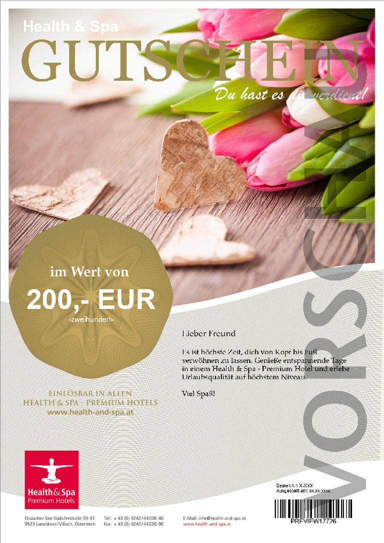 Überraschen Sie Ihre Liebsten, Freunde und Bekannten mit Zeit für sich. Der Wellness-Gutschein der Health and Spa - Premium Hotels ist das ideale Geschenk für Genuss- und Gesundheitsurlauber und kann jederzeit in allen Mitgliedsbetrieben eingelöst werden. Sie selbst bestimmen den Wert, die Beschenkten entscheiden über Hotel, Ort und Urlaubszeit.